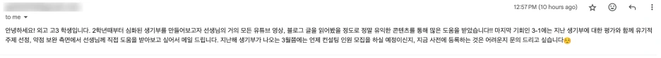 "안녕하세요! 외고 고3 학생입니다. 2학년때부터 심화된 생기부를 만들어보고자 선생님의 거의 모든 유튜브 영상, 블로그 글을 읽어봤을 정도로 정말 유익한 콘텐츠를 통해 많은 도움을 받았습니다!! 마지막 기회인 3-1에는 지난 생기부에 대한 평가와 함께 유기적 주제 선정, 약점 보완 측면에서 선생님께 직접 도움을 받아보고 싶어서 메일 드립니다. 지난해 생기부가 나오는 3월쯤에는 언제 컨설팅 인원 모집을 하실 예정이신지, 지금 사전에 등록하는 것은 어려운지 문의 드리고 싶습니다"