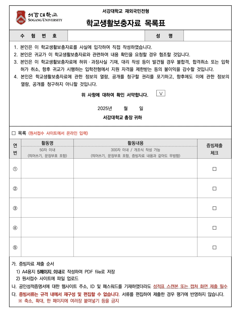 성대 활동증빙자료는 서강대와 마찬가지로 5개 입니다. 증빙서류는 총 10매까지 제출이 가능합니다.