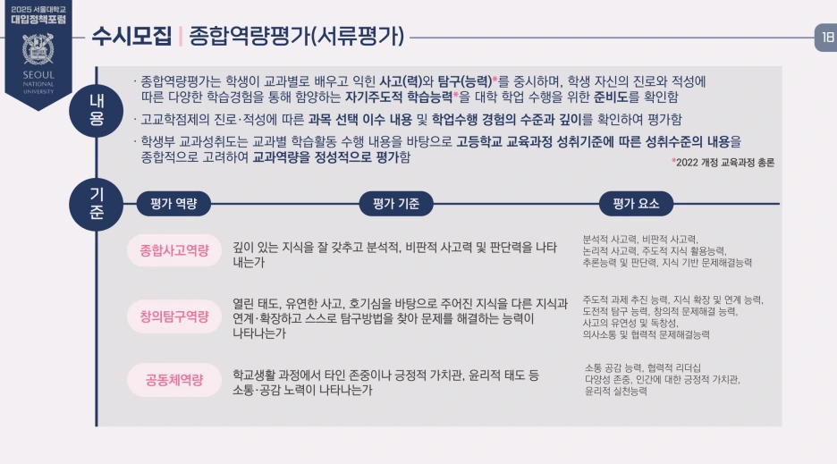 서류평가(생기부 평가)의 주요 기준은 종합사고역량/창의탐구역량/공동체역량 입니다.