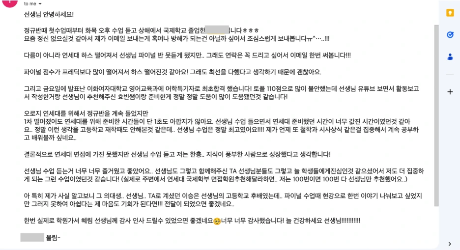 오로지 연세대를 위해서 정규반을 계속 들었지만 1차 떨어졌어도 연세대를 위해 준비한 시간들이 단 1초도 아깝지가 않아요. 선생님 수업 들으면서 연세대 준비했던 시간이 너무 값진 시간이였던것 같아요... 정말 이런 생각을 고등학교 재학때도 안해본것 같은데..