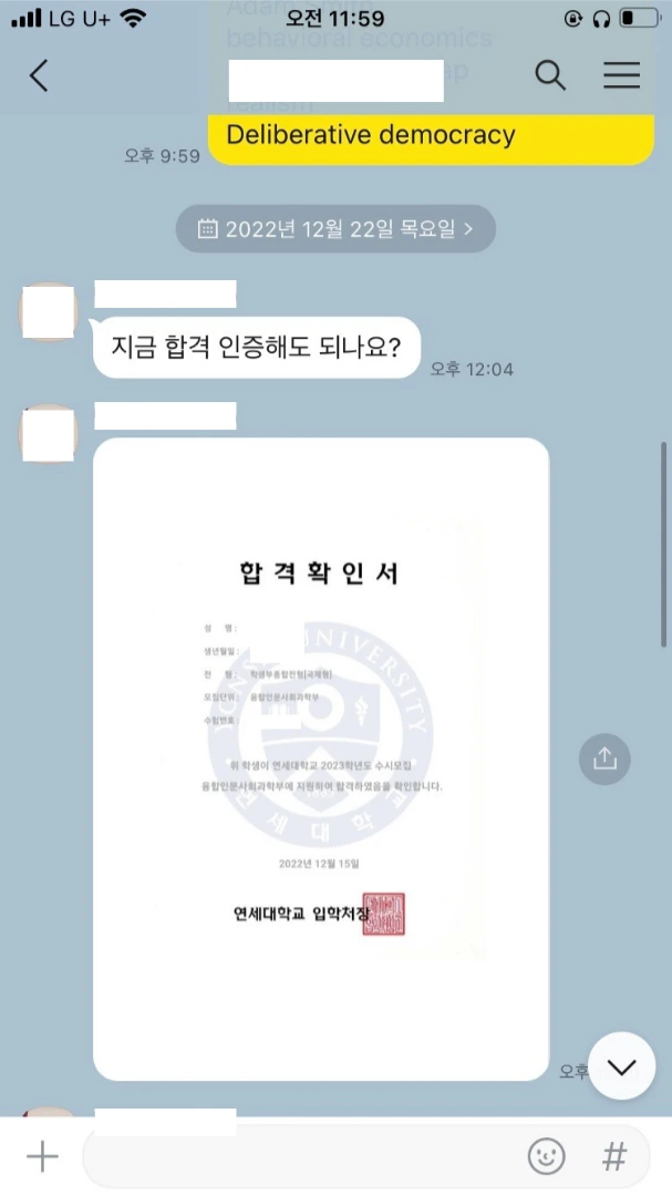 혜림쌤 수업이 면접 구조의 틀을 제공해주었기 때문에 어떤 제시문이 나오던지 자신있게 답변 할 수 있었습니다. 또한 혜림쌤께서 주시는 필수 어휘도(영어+한국어 모두) 매우 도움이 되었습니다. (고려대 면접에서 해당 어휘를 많이 활용했더니 교수님들 표정이 더 밝아지셨습니다.) 특히 연세대 UIC의 1학년 시기 이수해야 할 CC(Common Curriculum)에 대한 우수한 학점의 비교우위를 차지할 수 있다는 이점도 있습니다.