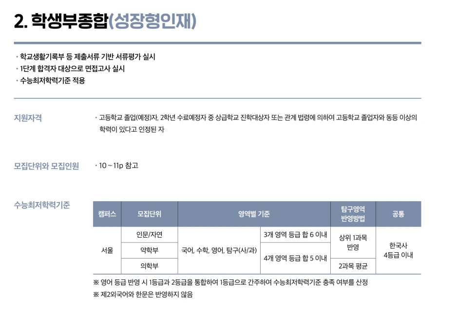 수능 최저 3합 6 이며 여기에 인성면접까지 보기 때문에 분명히 모든 학생들이 꺼리는 전형이 될 것입니다