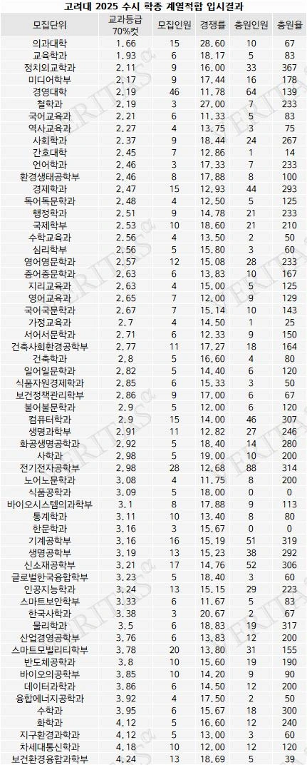 우선 가장 궁금하실 합격자 내신 70% 컷 입니다