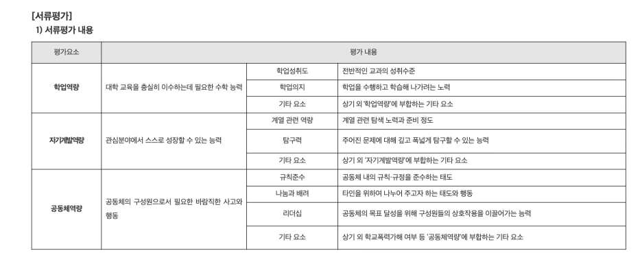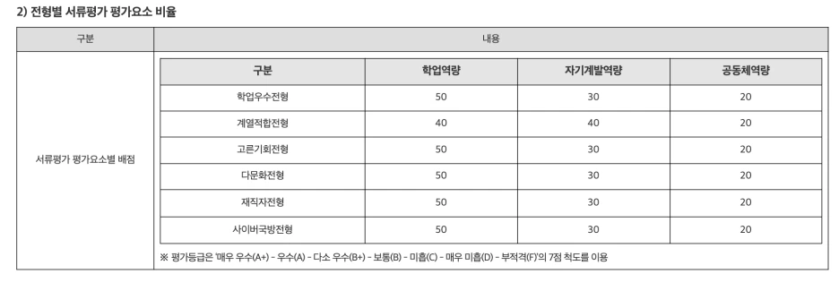 각 전형별 서류평가 평가요소 비율은 다음과 같습니다