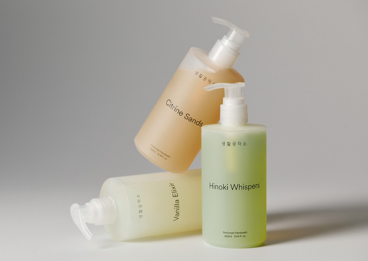 생활공작소 퍼퓸 퍼스널 케어라인(이하 퍼퓸 라인)의 첫 번째 제품인 퍼퓸 핸드워시 3종을 제작했습니다. 기존 제품과는 다른 차별화된 디자인과 앞으로 출시될 퍼퓸라인 제품들에 적용할 수 있도록 디자인 가이드 제작이 필요했습니다.