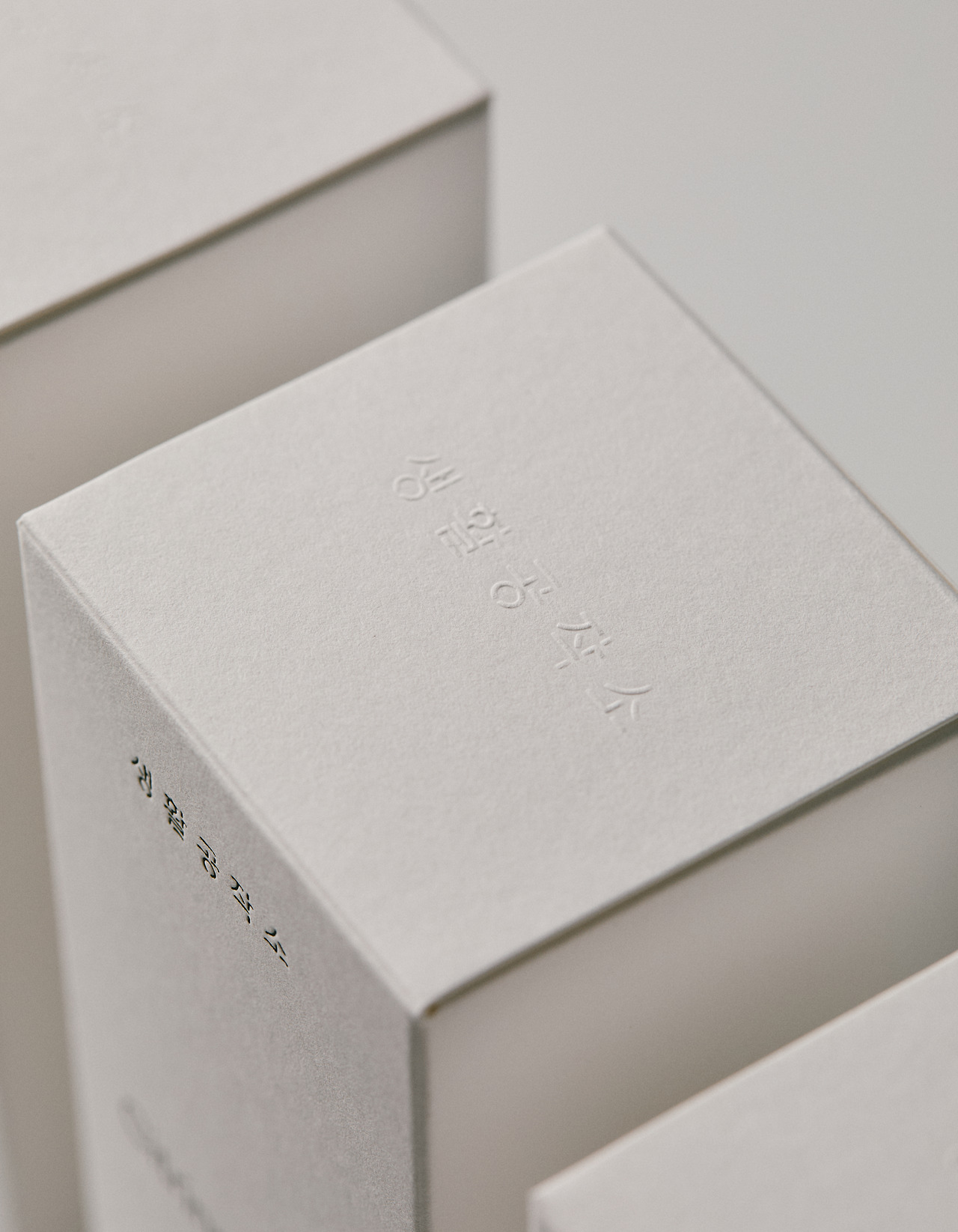 향을 나타내는 컬러를 사용할 수도 있었지만 제품의 첫인상이 컬러로 결정될 수도 있어서(또한 자연유래 색소를 사용하여 내용물의 색상편차가 있었습니다.) 생활공작소의 특징인 블랙&화이트를 유지하고 종이 텍스처가 자연스럽게 노출되고자 했습니다. 코팅이 없을 시 제작 및 배송과정에서의 오염 이슈가 발생하진 않을지 검토 후 종이를 선정했어요. 다양한 종이 샘플 비교를 위해 더페이퍼랩을 방문했고 그중 텍스처, 단가, 평량, 색상의 기준에 맞는 올드밀 프리미엄 화이트를 선택했어요. 종이 텍스처를 살린 만큼 고급스러움을 극대화하기 위해 전면에는 먹박을 사용했습니다. 상단에는 슬로건이나 메시지를 기입할 수도 있었지만 불필요한 내용을 넣는 것보단 로고를 넣는 선택을 했고 로고가 중복되는 만큼 은은하게 형압으로 표현했습니다.