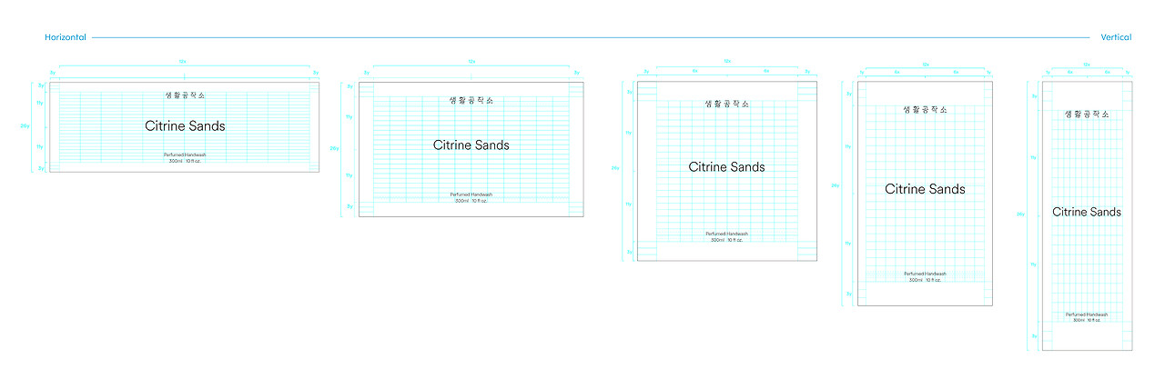 그리고 앞으로 출시될 퍼퓸 라인 적용을 위한 디자인 가이드가 필요했습니다. 제품 라인업은 정해졌지만 실제 제품 사이즈 예측은 아직 어려운 단계이기 때문에 비율에 따른 가이드를 제작했습니다.