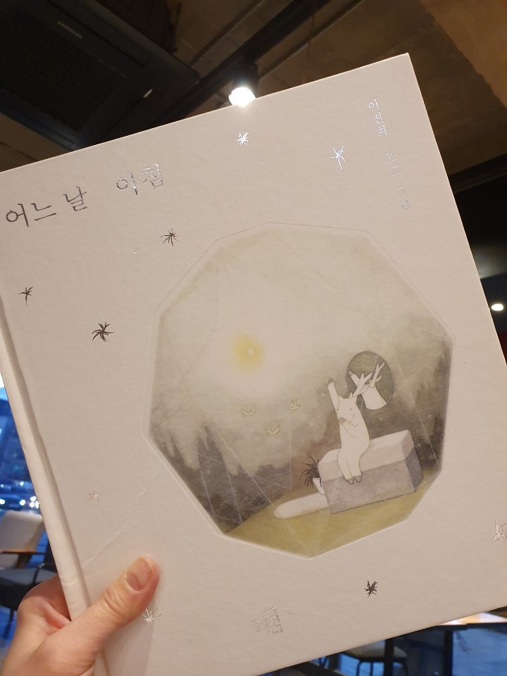로 시작하는 그림책인데요, 어느 날 아침 아름다운 뿔이 사라진 사슴이 며칠을 울다 잃어버린 한 쪽 뿔을 찾아 떠나는 여정을 담았습니다. 개미핥기가 주어준 나뭇가지를 머리에 꽂고 다시 찾아 나섭니다. 뿔처럼 꽂았던 가지 뿔로 물에 빠진 쥐토끼를 구해주기도 하고 반쪽을 잃어 슬픔에 빠진 반달에게 뿔을 가리기 위해 둘렀던 스카프를 둘러주며 아픔을, 슬픔을 같이 합니다. 숲에서 잃어버린 뿔과 비슷한 것이 있는지 찾다가 남은 뿔도 떨어지는 슬픔이 있습니다. 다시 집으로 오기 위해 오래도록 걸었습니다. 집에 돌아와 거울 앞에 선 사슴은 작은 두 개의 뿔이 솟아난 것을 보았습니다. 어느 날 아침에.