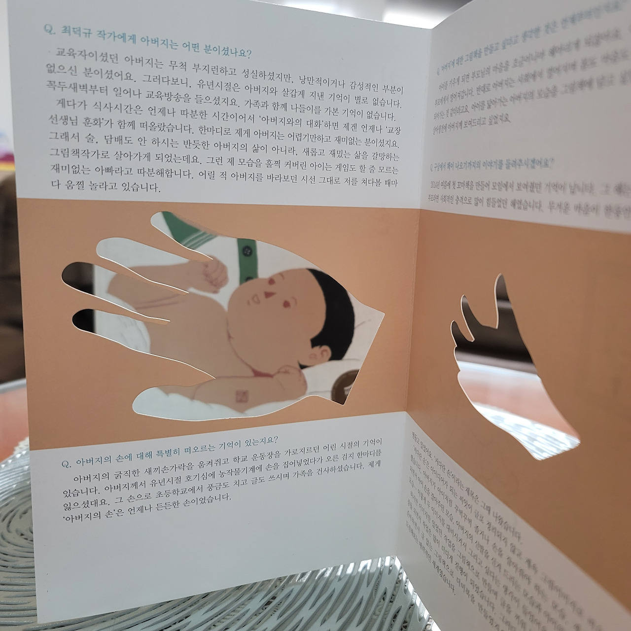 커다란 손 띠지를 내리면 하얀색 담요에 누원 웃는 아이를 볼 수 있다.