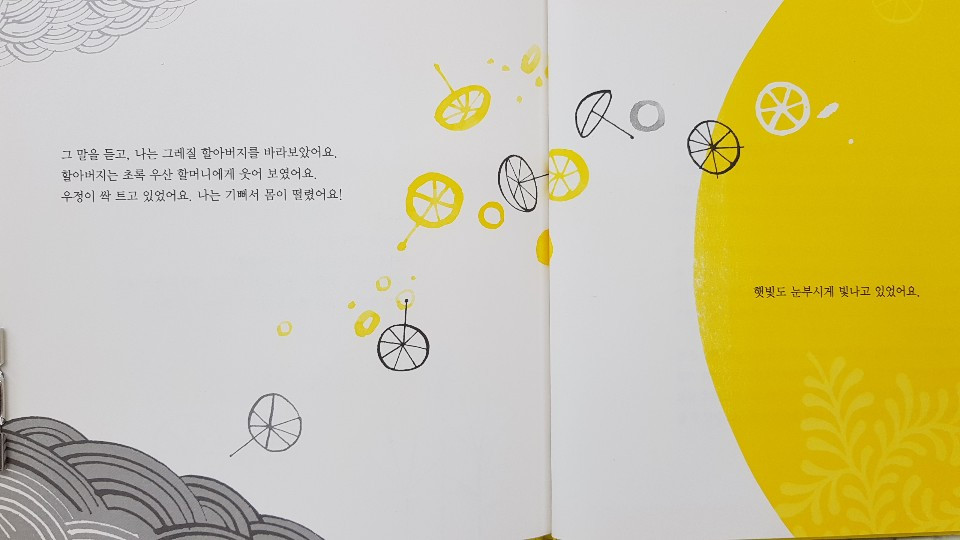 이렇게 제 자신에게 한 선물도 애지중지 오래오래 손에 지니며 추억을 이야기 하는데, 할아버지가 사랑하는 할머니에게 사준 우산은 어떨까. 갑작스럽게 돌아가신 할머니가 가장 아끼던 노란 우산을 본 할아버지의 마음은 또 얼마나 애잔하겠다는 마음이 보여 슬프다.