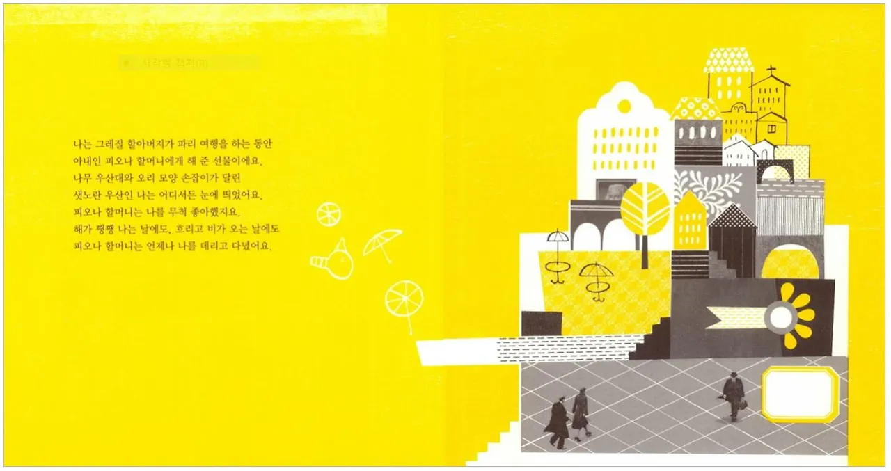 그레질 할아버지가 파리 여행을 하는 동안 피오나 할머니에게 선물해준 노란 우산을 무척이나 좋아하는 할머니는 비가 오거나 흐리거나 눈이 오거나 비오는 날에도 언제나 데리고 다니며 아끼셨다. 여러분들도 누군가 선물해준, 애지중지 아끼는 선물이 있을 것이다.