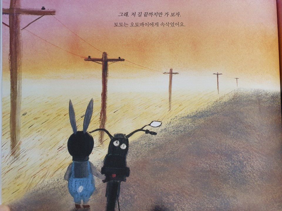 집 앞 도로 옆을 한 번도 벗어나보지 못한 토토에게 세상이야기며 세상 풍경모습을 이야기 해주는 슈슈 할아버지는 오토바이를 타며 세상 구경을 한다. 얼마나 멋진 곳을 보았는지, 아름다운 달님을 보고 얼마나 소리를 지르는지를 이야기 해주며 삶의 지평을 넓힌 이야기로 행복해 한다. 세상을 곁에서 본 것처럼 행복해 하는 토토에게 더 이상의 슈슈할아버지가 없을 때 그 절망감. 슈슈할아버지가 남겨준 오토바이를 오랫 동안 두고만 보다가 마침내 용기를 낸 토토. 그리고 토토가 보는 세상이 바뀌는 풍경과 토토의 마음이 고스란히 전달되어지는 그림책. 진정 바라는 것을 이루기 위한 새로운 도전, 그 도전을 하기 위한 용기와 소망을 담은 토토의 작은 다짐. 이런 모습을 보면서 저도 ‘내가 바라는 것’과 ‘내가 도전할 수 있는 것’을 생각해 보게 한다. 그리고 도전해서 얻은 세상 이야기를 도전을 두려워 하는 누군가에게 새로운 세상 이야기를 들려줄 수 있지 않을까?