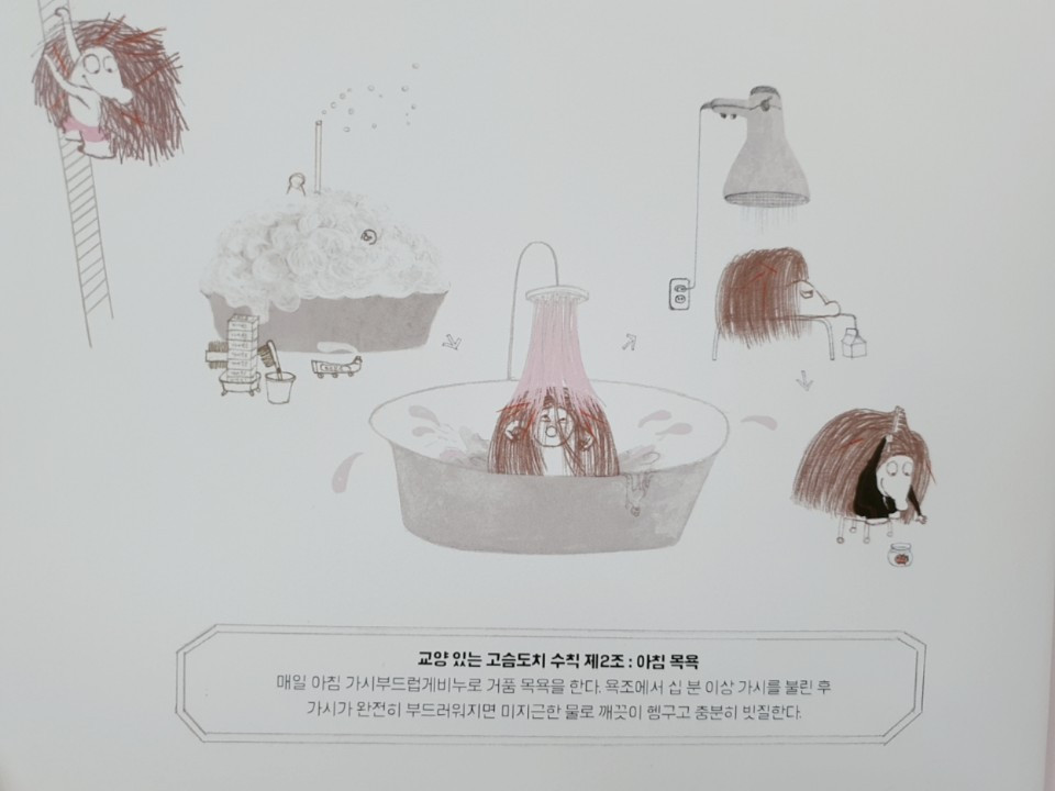 그 도시에 사는 고슴도치들은 안전하고, 완벽하고, 세련된 몸가짐을 하고 살아야 한다. 고슴도치가 지니고 있는 가시가 겉으로 들어나면 완전체 고슴도치가 아니어서 별도의 조치를 받아야 한다. 그래서 아무도 가시를 세우지 않고 부드럽게 눌러놓고 세련되게 꾸미고 다녀야 한다. 가시를 세우지 않기 위해 ‘가시부드럽게비누’를 사용하고 샤워를 하면서 꼭꼭 가시를 눌러놓는 연습을 한다. 학교에 다니는 고슴도치 학생들은 매일 가시검사를 하여 뾰족한 가시가 있으면 따로 ‘교양 있는 가시교육’을 받아야 하고 학교에서 청소를 해야 하는 벌을 받는다.