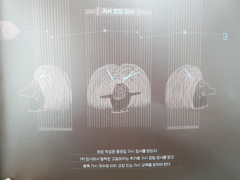 주인공 고슴도치 엑스는 처음엔 자기다운 모습이 남과 같아야 하고, 남과 같기 위해서 같은 생활패턴과 같은 가치관 교육을 받으며 자랐다. 조금이라도 남과 다른 것은 용납할 수 없기 때문에 가정이나 학교에서 조차 틀에 맞는 것만을 강조한다. 우리들도 거의 비슷하지 않는가? 남과 다른 생각을 이야기 하면서 주변을 의식해야 하고, 남과 다른 말을 하면 주변의 시선을 감수해야 하고, 남과 다른 옷차림이나 취미를 가지고 있으면 별나다는 소리를 들으며 조금은 이상한(?) 사람임을 인정하며 살아가게 된다.