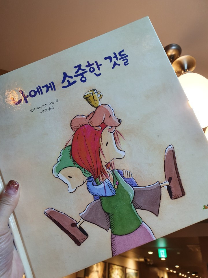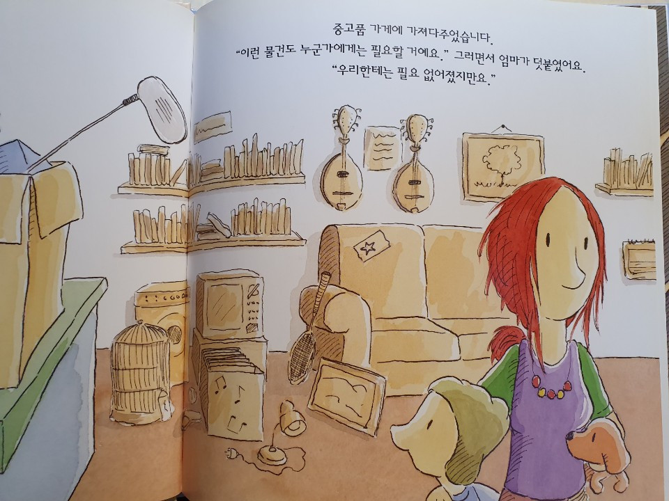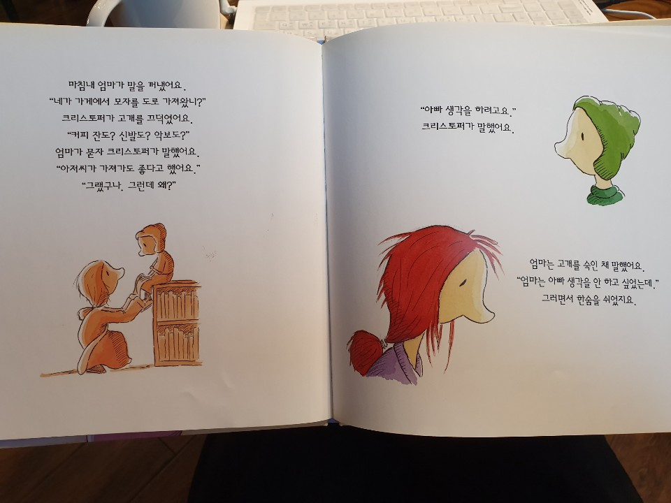 그림책에 나오는 크리스토퍼 라는 친구인데 그 친구는 남자아이, 성별은 다르지만 저 멀리 하늘나라에 가신 아버지를 그리워하는 마음은 같은 친구랍니다. 아빠랑 어릴 적 놀았던 추억, 아빠가 사준 물고기, 어항에 넣고 기르던 기억, 아빠가 즐겨 쓰던 초록색 낡은 모자, 아빠가 쉴 때 마다 즐겨 치던 기타와 피아노 등등 크리스토퍼도 매일 아빠의 물건을 만지작 거리면서 아빠를 그리워해요. 똑같죠? 친구가 그림책 주인공과 같은 마음을 먹는 게 신기하지 않나요?