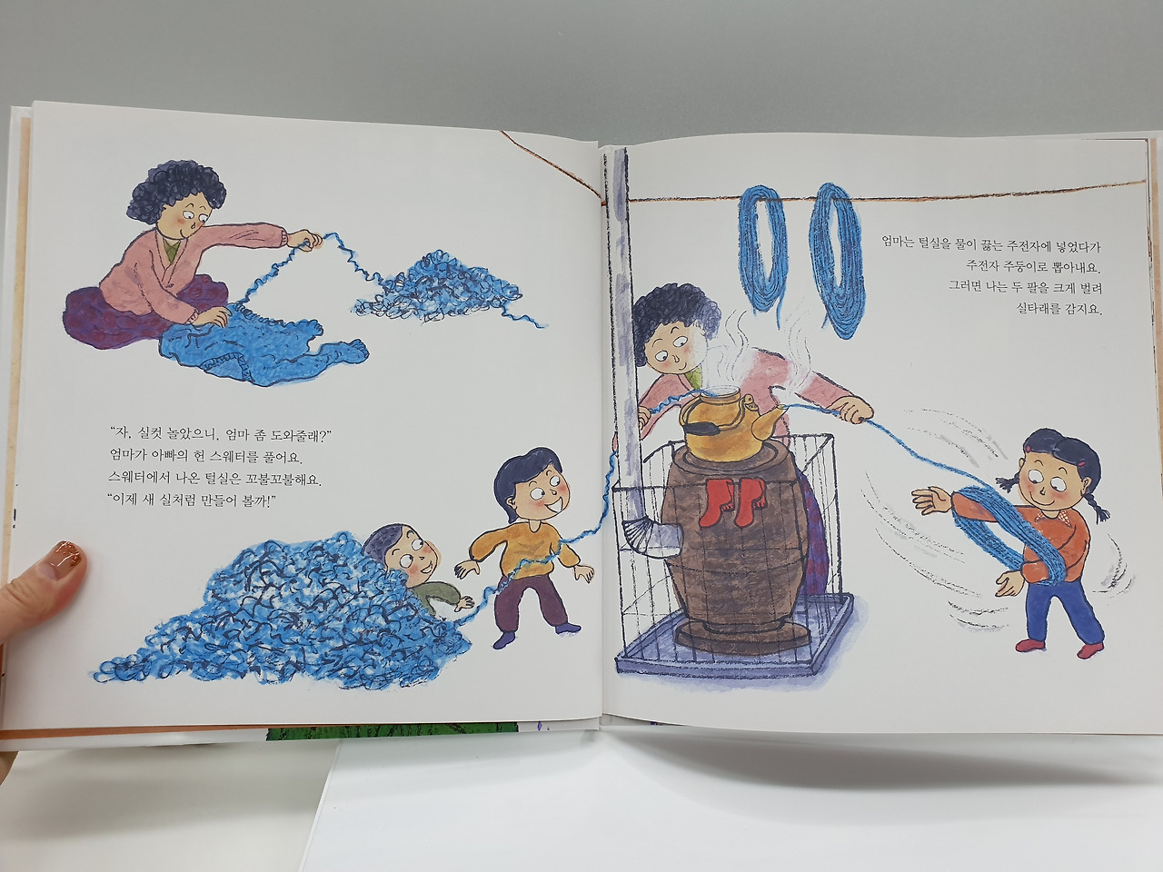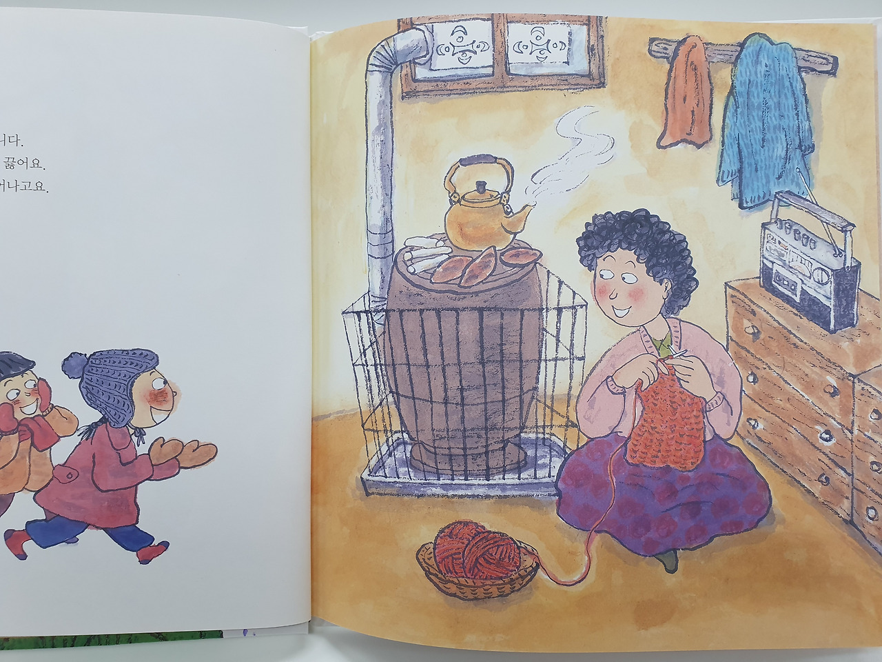 가을이 되면 장롱에서 털로 짠 스워터나 조끼, 내복들을 꺼내어 일일이 풀 때 오빠랑 나랑 우리 남매들은 손을 항이리 안듯 벌리면서 엄마가 푸는 털실을 이쪽저쪽 팔벌려 옮기면서 실을 받았다. 큰 안방같은 거실 위쪽에 있는 난로. 난로 위엔 커다란 물주전자가 있었고 지금의 가습기 역할을 충분히 했다. 오빠들이 팔벌려 걷은 털실은 주전자 입을 통해 다시 나오면 우와~ 그 납짝하고 라면 만큼 보글보글하던 털실이 어느새 털실이 폭신폭신해진다. 너무 신기했다. 어릴 적 나는 오빠들과 엄마가 주전자와 함께 힘합쳐 요술을 부리는 줄 알았다. 나도 해보겠다고 떼를 썼지만 데이면 큰 일 난다고 감는것만 시켜서 입이 뽀로퉁 해지기도 했다.