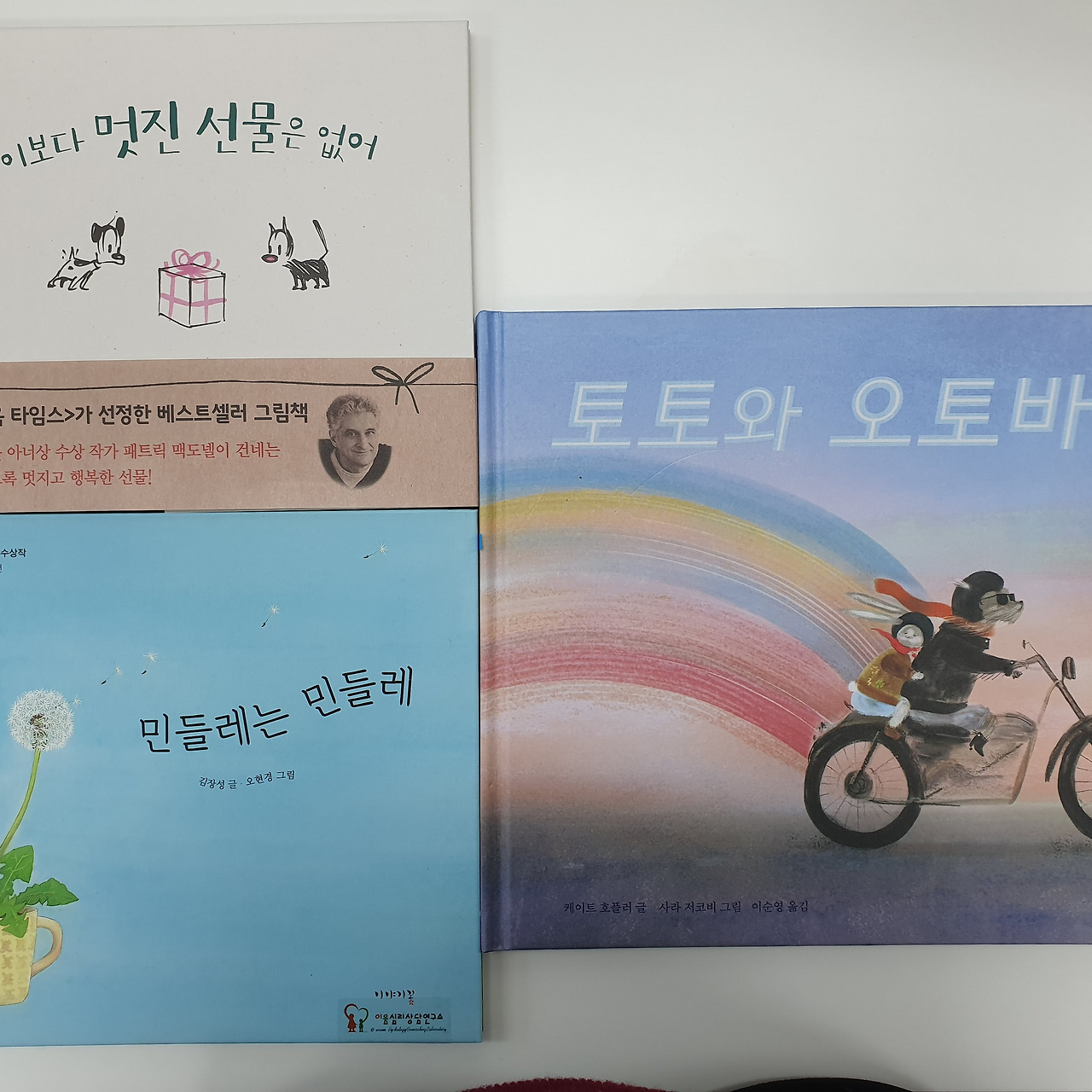 저는 3권의 그림책을 여러분들도 알고 계시는 <이보다 멋진 선물은 없어>, <민들레는 민들레>, 그리고 <토토와 오토바이>를 준비했어요.