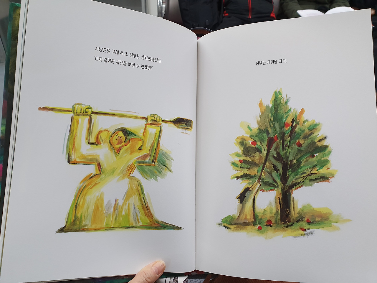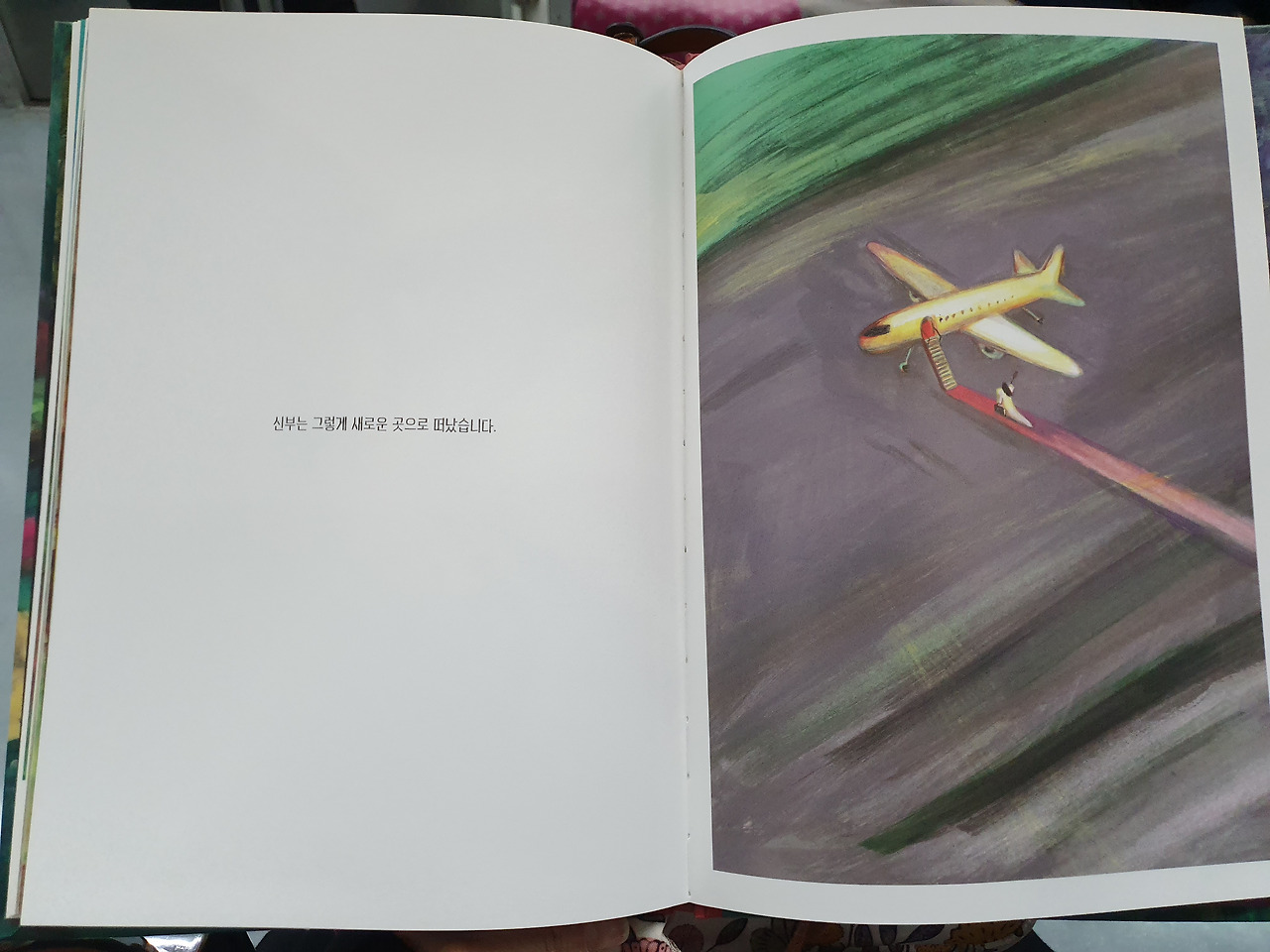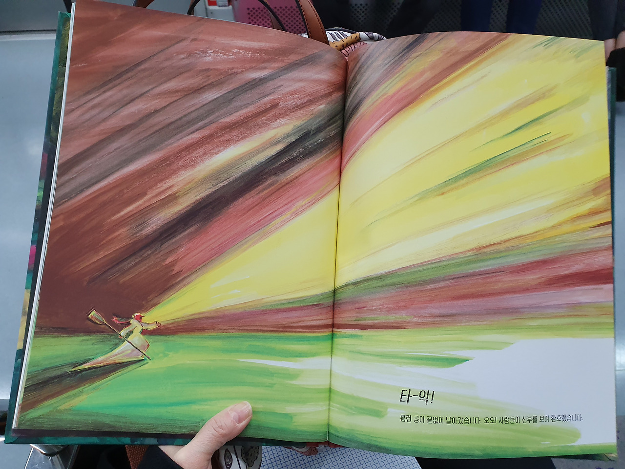 또한 나의 결혼을 떠올리고 내가 꿈꾼 결혼생활을 회상하며 과감히 던지고 떠나온 19년 전의 내 모습과 지금의 모습에서 나를 투영해 보니 이 그림책의 주인공 신부에게서 내 모습도 동일시 된다. 그래서 더욱 통쾌했는지도 모른다. 과감한 결단력과 실천의지, 그리고 모험을 두려워하지 않는 도전과 용기를 내는 신부. 삶은 주도적이어야 한다. 의존적이거나 맡겨진 삶은 비굴해질 수 있다. 또한 '나다운 모습'이 아닌 '되어야 하는 하는 모습' 으로 살아갈 때의 두눅듦과 왜소된 자기 가치관이 병든 인생을 야기할 수 있다. 멋진 신부의 인생을 담은 #노를_든_신부 그림책을 지하철에서 내내 순환적 반복읽기를 한다. 지금 왜 이리 기분이 좋은지.