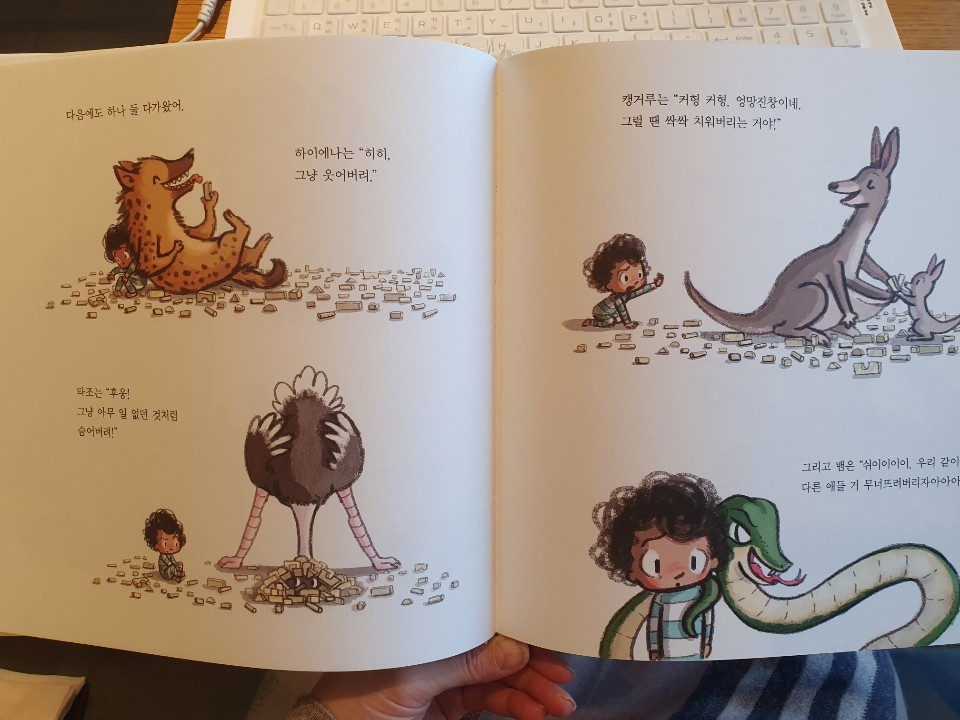블록을 쌓고 놀던 테일러가 난데없이 날아온 새들로 블록이 무너졌는데 테일러는 ‘모든 게 무너지고 말았다’며 생각하며 울고 있습니다. 닭이 나타나 호들갑 스럽게 맞장구를 치며 이유를 캐묻고 시끄럽게 합니다. 말하고 싶어 하지 않자 그냥 가버리는 닭 뒤에는 곰이 왔습니다. 화나겠다며 오히려 더 크게 화를 내고 소리를 지르고, 코끼리는 고쳐주겠다고 귀찮게 생각을 묻습니다. 하이에나, 타조, 캥거루, 뱀까지 나타나 테일러의 마음을 자기식으로 위로했습니다.