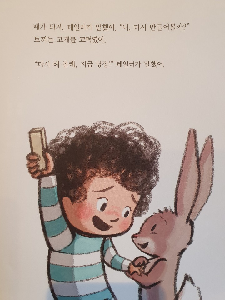 테일러가 꼼짝도 않고 동물들에게 반응을 보이지 않자 동물들은 가버립니다. 테일러는 여전히 혼자 힘들어 합니다. 그럴 때 토끼 한 마리가 조용히 다가옵니다. 그러고는 테일러 곁에 따뜻한 체온으로 머물며 말없이 앉아 있어주었습니다. 오래도록 곁에 떠나지 않으며 테일러를 말없이 응원해주었습니다. 토끼 식으로 하지 않고 테일러가 스스로 고민하고 생각해 내서 문제를 해결할 때까지 있어주었습니다. 테일러 혼자 멋지게 더 멋지게 해냈습니다. 그러면서 “다시 해 볼래”라고 자기를 믿습니다.