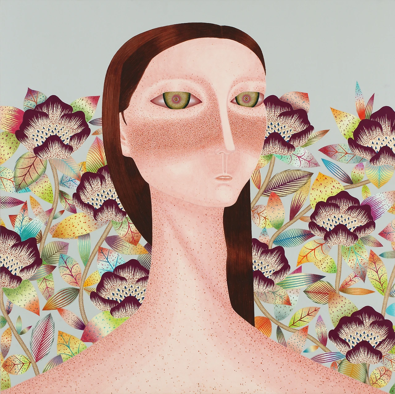 실재하지 않지만, 저에게 안정감을 주는 꽃들이 그녀를 감싸고 있습니다