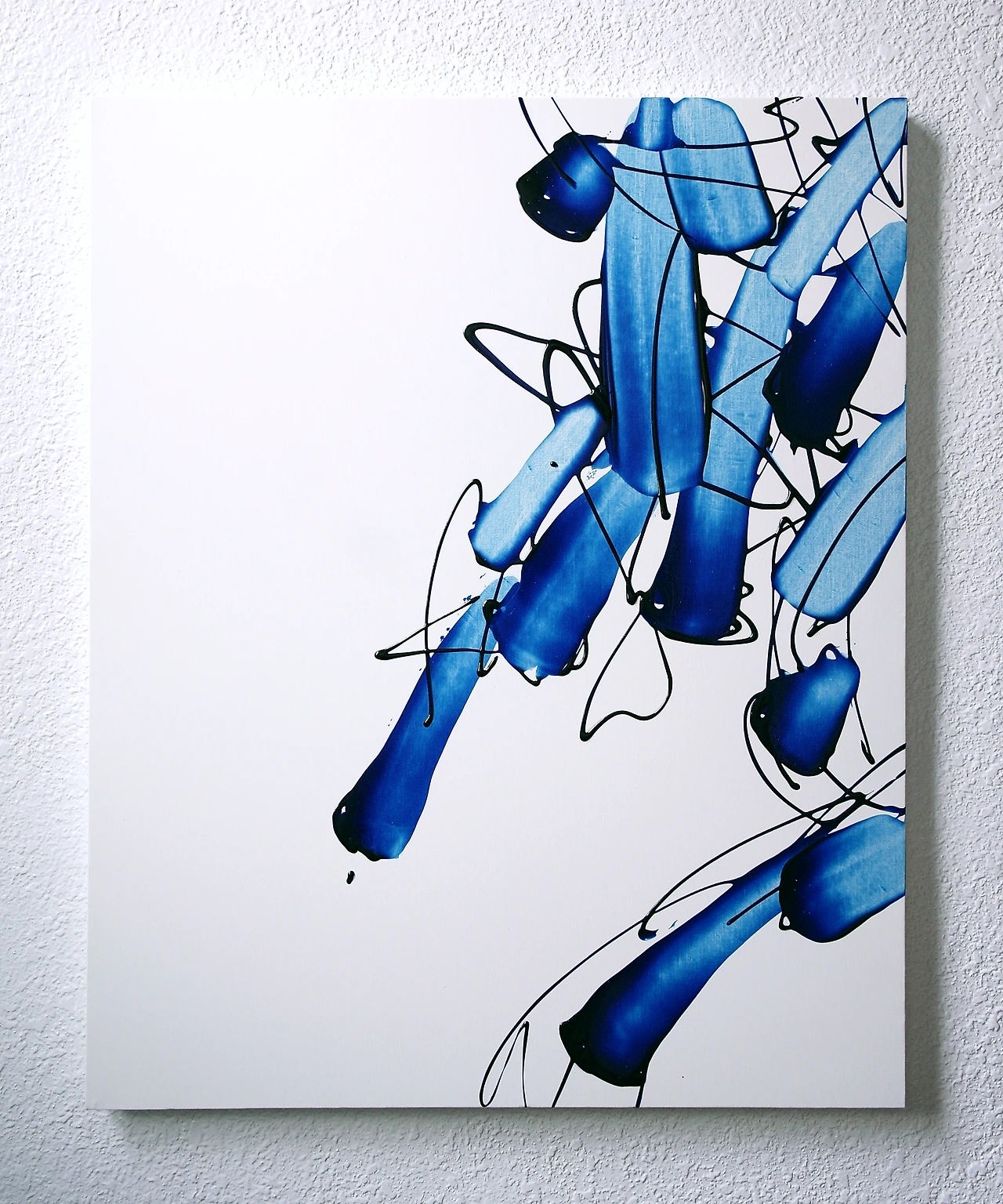 정지의 시작은 그림의 완성에 대해 고민하다가 나온 제목입니다. 추상화는 완성의 기준을 세우기가 어려운데, 사람이 움직임이 완전히 멈추면 생이 끝나듯이 그림 속의 움직임을 멈추면 그림의 완성이 아닐까 생각했습니다. 하지만 먹지 말라면 더 먹고 싶어 지고 하지 말라면 더 하고 싶어 지듯이(반대의 법칙에 의해) 그림 속 움직임을 멈추려 하면 할수록 멈추지 못하는 그림이 되었고 이를 통해 움직임과 멈춰있는 양면성을 표현할 수 있다고 생각했어요. 작품의 제목들은 중력, 출발의 완성, 정지의 시작, 자유의 법칙, 상승 낙하 등 반대성을 나타낼 수 있는 제목들을 만들었습니다. 그리고 시리즈들은 제목이 다르지만 사실 본질을 같이합니다. 하나로 봐도 되고, 개별로 봐도 좋습니다.