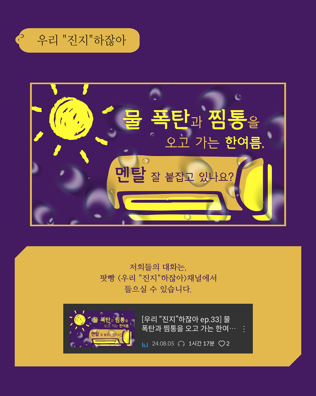 팟빵 <우리 “진지"하잖아> 채널에서 청취하실 수 있습니다.
