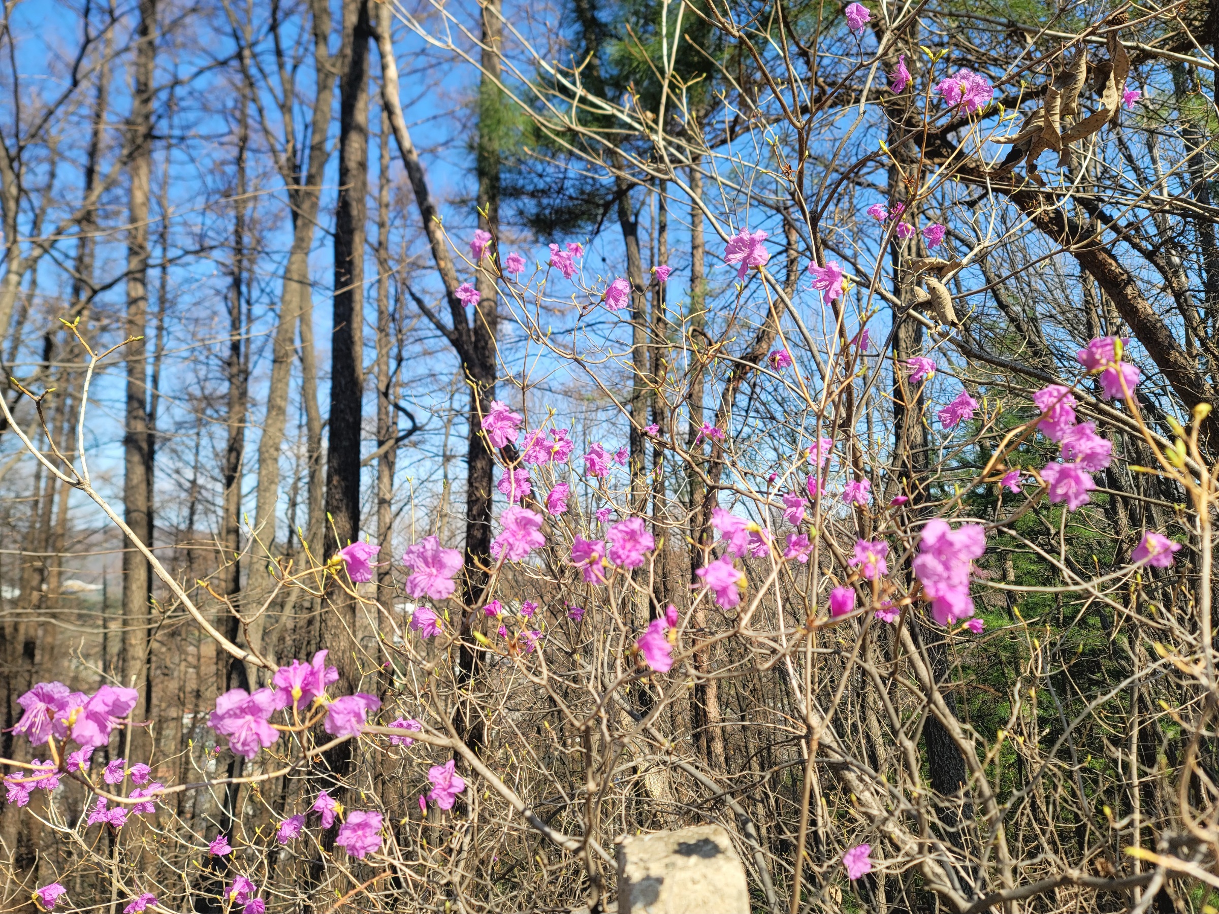 산 겨드랑이에 핀 연분홍 진달래에서
