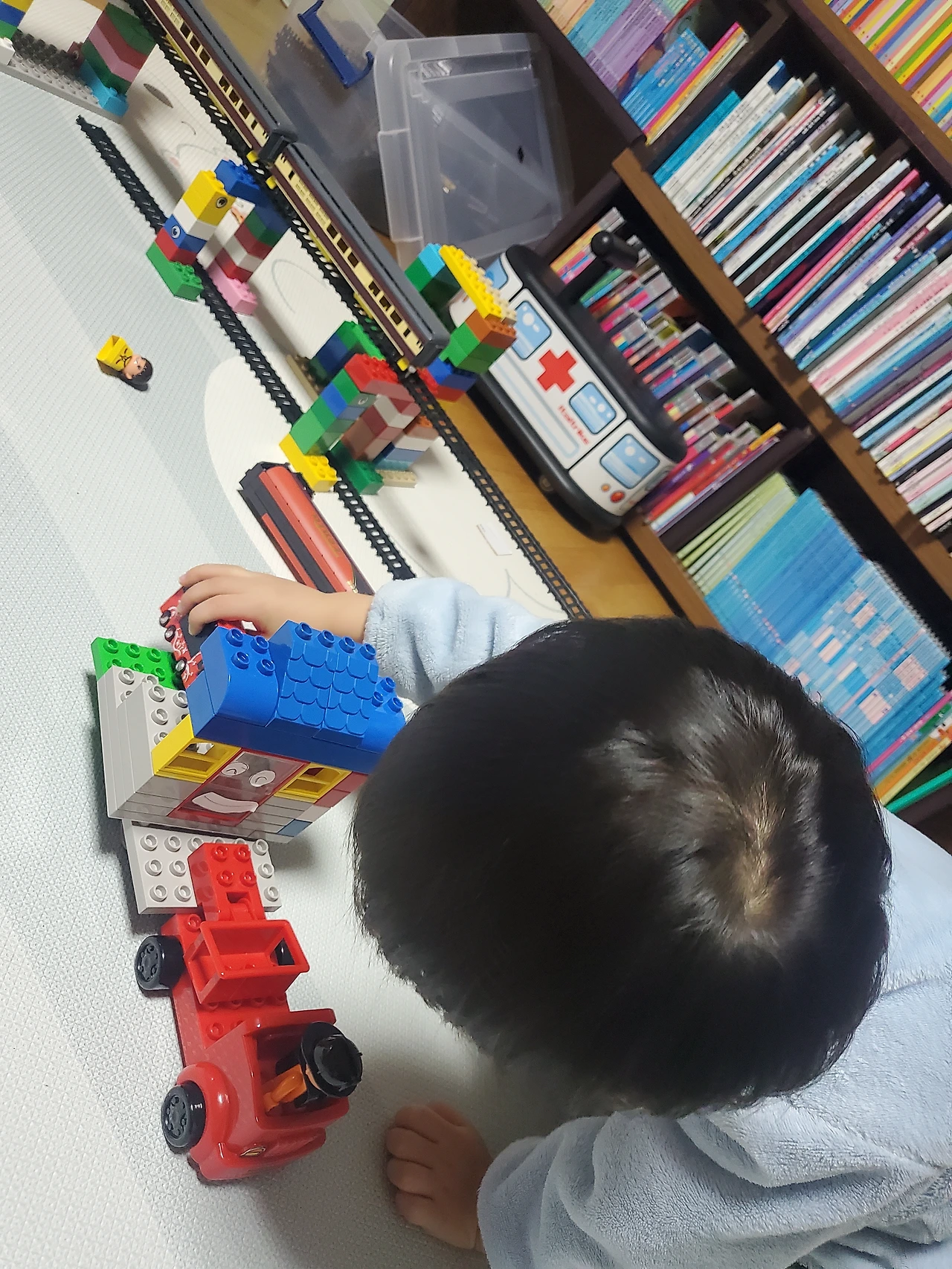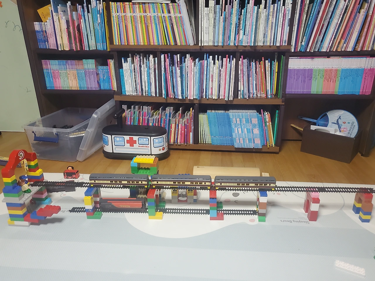 6세 아이이기 때문에 흥미 위주의 독후활동을 계획하려 했다. 레고 블록으로 기찻길, 아파트, 기차역, 소방서, 경찰서 등 마을을 만드는 것을 좋아하는 남자 아이라 가장 기억에 남는 장면을 레고 블록으로 만들어보면 좋겠다고 생각을 했다. 이미 지상철과 지하철이 나오는 장면에서부터 집에 있는 기차 레일을 꺼내 들고 만들어보고 싶어 했고 듀플로 레고 블록까지 꺼내 아파트와 작은 집을 만들었다. 그리고 만든 집에 눈코입 표정을 이야기하고 직접 붙이게 하였다. 일단 레고로 만드는 게 시간이 걸려 거의 독후활동이 1시간 이상 걸렸기에 시간이 많은 주말에 하면 좋을 것 같다. 또한 아이가 너무나 즐거워하며 만드는 모습을 보니 나 또한 즐거워진 활동 시간이었다.