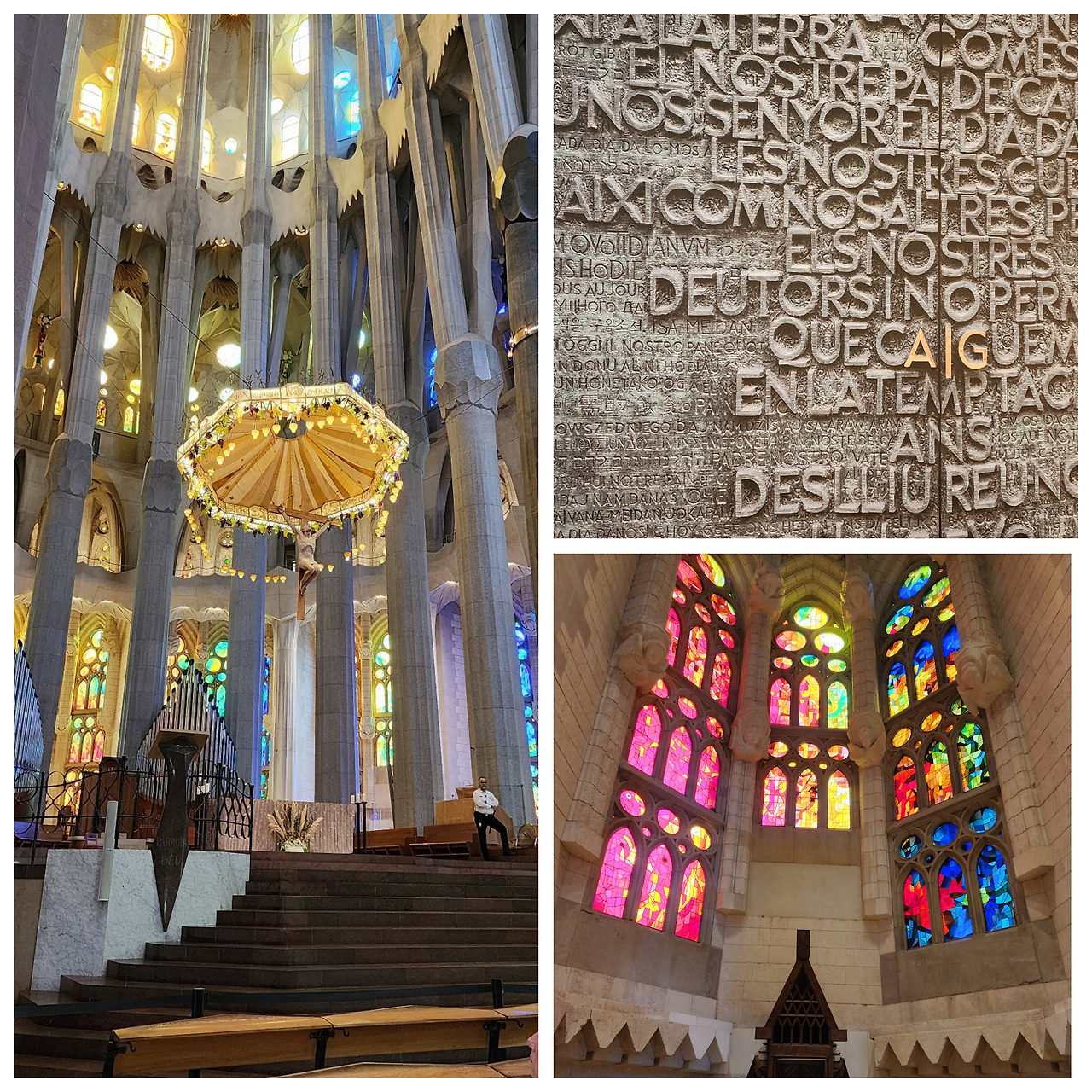 몬세라트의 경건한 숲의 이미지와 자연을 모티브 한 내부는 동쪽에서 해가 뜨면 파랑과 연두, 초록등으로 구성된 스테인드 글라스의 빛은 탄생을 의미하고, 서쪽에서 해가 지면 빨강, 주홍, 노랑으로 사망을 나타낸다고 한다. 태양의 위치에 따라 탄생과 죽음의 상상력을 최대한 빛으로 자극하는 성상들이 묵상하는 내내 살아서 움직이는 듯 성스러웠다.