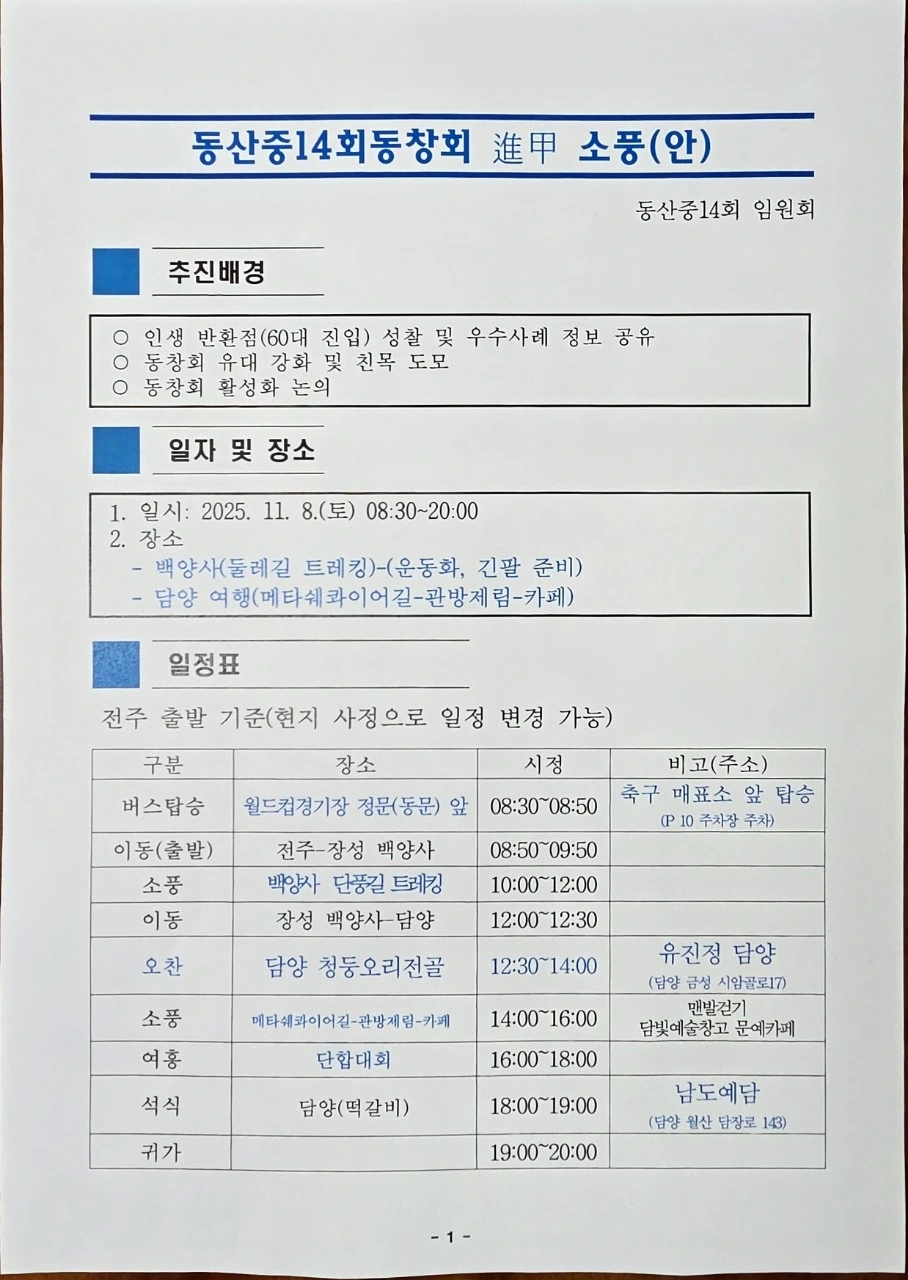 중학교 동창회에서 진갑을 기념해 단체 소풍을 가기로 했습니다.