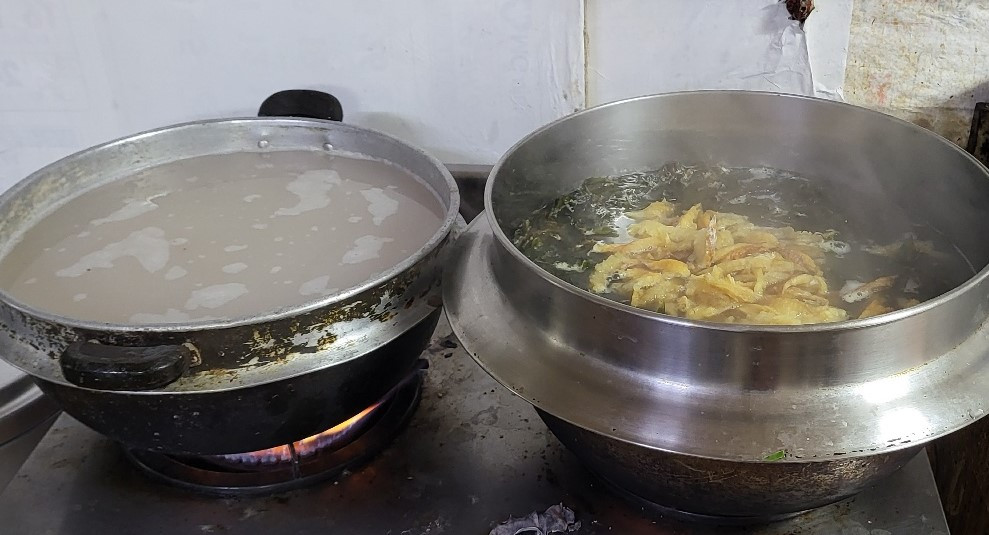식당은 12시 좀 전에서 12시가 좀 넘은 시간의 언젠가 쯤에 문을 연다. 엄밀히 말하면 주인 할머니가 밥과 국과 반찬을 얼추 다 만들면 그때부터 손님을 받는다. 물론 미리 와서 앉아 기다려도 된다. 할머니 조리하시는 거 구경하면서, 두런두런 이야기도 하면서. 조금 늦으면 줄 서서 기다리거나, 못 먹을 수도 있다, 이런.