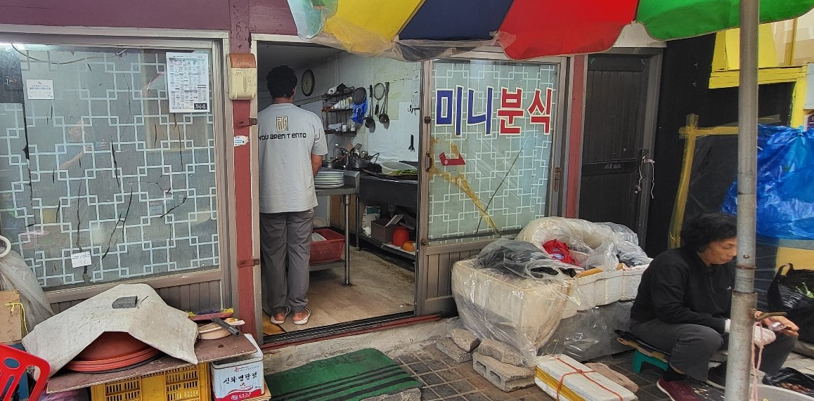 속초 관광수산시장 정류장에서 버스를 내려 길을 건넌다. 관광수산시장 제3문 방향으로 들어가서 77미터쯤 가면 TV에 나와 유명해졌다는 코끼리분식이 있다. 그 집을 끼고 우회전해서 28미터를 간 다음에 좌회전해서 8미터를 가면 왼쪽에 식당이 있다. 미니분식. 지금 영업하나, 하는 생각이 절로 든다. 좁고 작고 낮은 집이다. 출입문 앞에는 채소 등속을 파는 할머니의 좌판이 있다. 식당 안쪽을 수상한 듯 들여다볼라치면 좌판 할머니가 말씀하신다. 해! 그런데 아직 안 해.