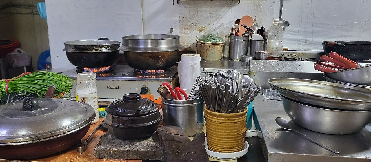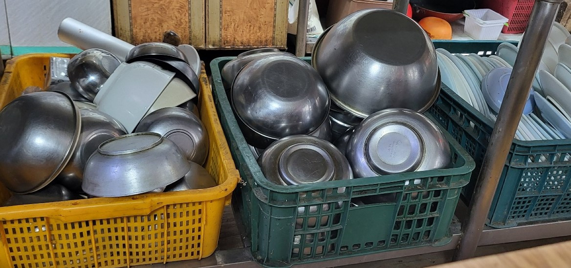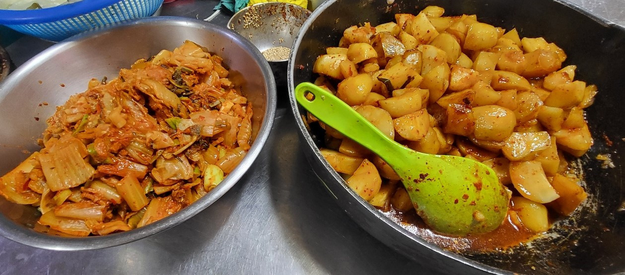 할머니처럼 늙은 조리 기구마다 오늘의 메뉴 반찬들이 볶고 굽고 무쳐진다. 고관절과 무릎이 몹시 안 좋은 할머니는 좁은 주방을 느릿느릿 이리저리 다니면서 더딘 손으로 음식을 만드는데 다 된 음식을 보니 손이 빠른 것이다. 밥과 국, 누룽지 기본 세팅. 매일매일 메뉴가 조금씩 바뀌며 즉석 조리한 여덟, 아홉 가지 반찬이 냄비며 큰 접시에 차려지면 어느새 좁은 식당을 가득 채운 손님들은 차례로 밥과 반찬을 큰 접시에 담아 먹는다. 그렇다. 바로 뷔페식 백반집인 것이다.