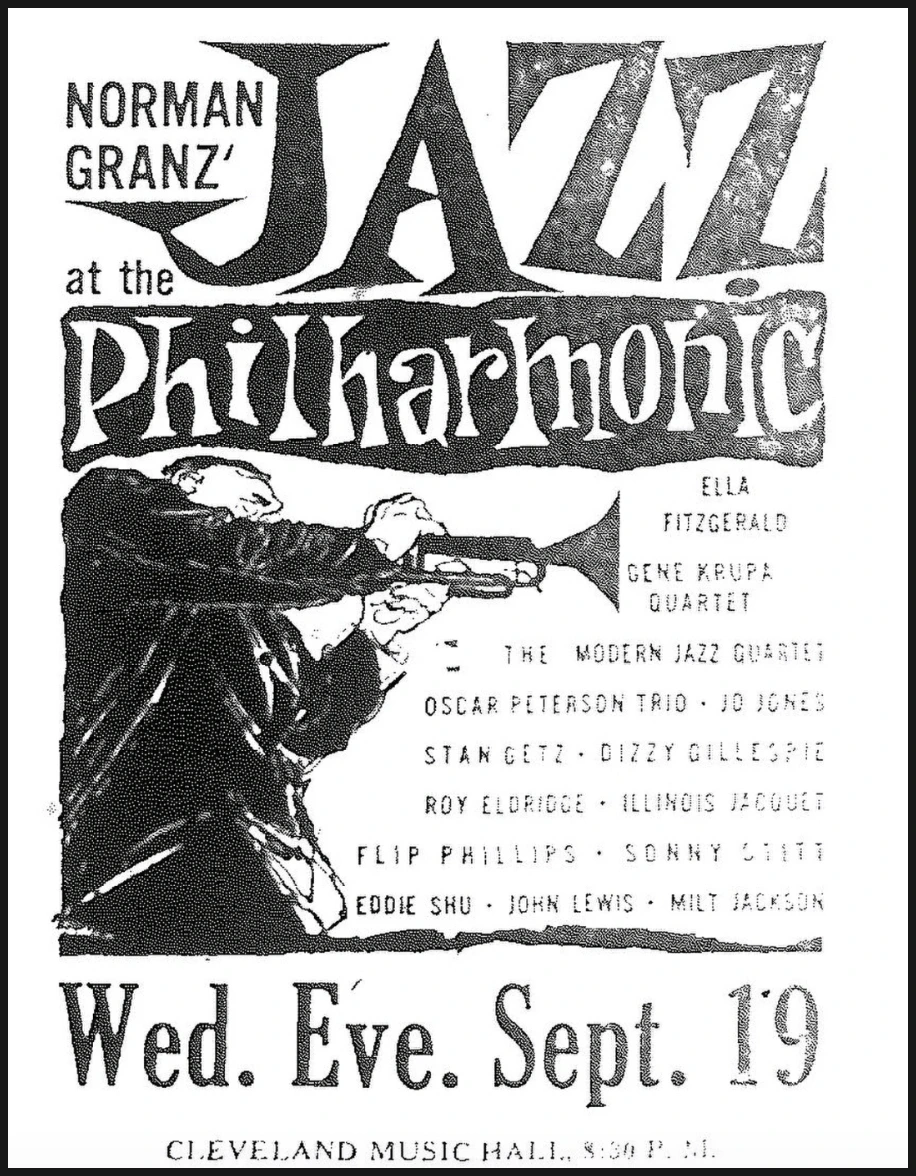 1956년 클리브랜드 공연 포스터(출처: ClevelandSGS)LA 필하모닉 오디토리엄에서 시작된 JATP의 역사를 간략히 살펴볼까요?