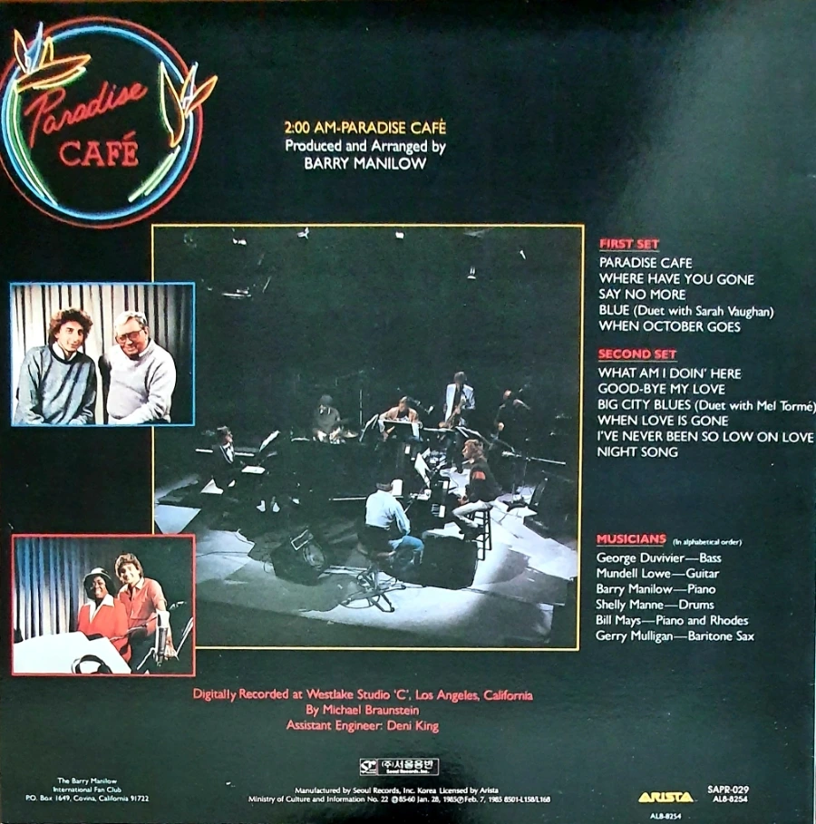매닐로우는 팝과 소프트 록을 넘나드는 만능 엔터테이너이지만 발표한 작품 중 돋보이는 재즈 앨범이 몇 장 있습니다. 그중 하나가 1984년 앨범 <파라다이스 카페, 새벽 2시>입니다. 매닐로우의 14집으로 그의 재즈 보컬을 만끽할 수 있습니다.