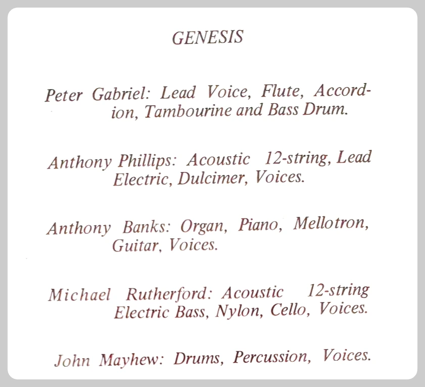 한편 앨범 제작 도중 안소니 필립스와 존 메이휴가 팀을 떠나게 됩니다. 이 둘을 대체할 멤버를 찾게 되었고 1970년 9월 15명의 드러머 후보자를 오디션하여 플레이밍 유스 출신의 필 콜린스를 낙점하게 됩니다. 또한 12월 스티브 해킷이 기타리스트로 조인하게 됩니다. 이 두 명의 가입은 제네시스로서는 전화위복이 됩니다. 이로써 제네시스를 대표하는 3집 <Nursery Cryme>과 4집 <Foxtrot>의 창조가 임박하게 됩니다.