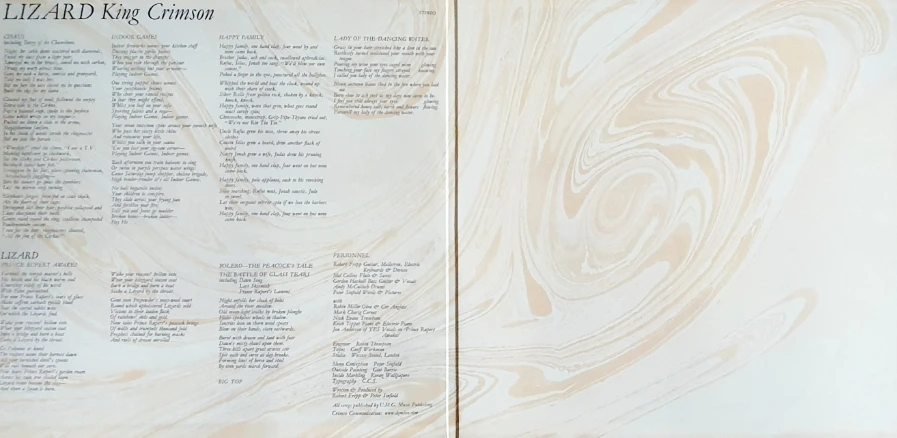 다른 밴드들과 달리 킹 크림슨은 가사를 담당하는 멤머 피터 신필드가 상당한 역할을 합니다.