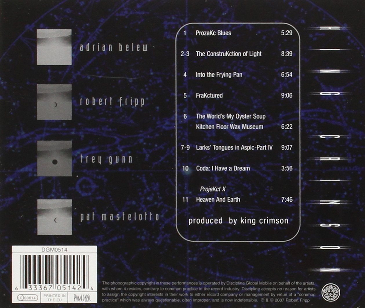 수록곡에도 이런 특징이 나타납니다. 총 11곡 중 Kc가 들어가는 제목이 다섯 곡입니다. 재미있는 제목도 보입니다. 앨범은 크게 두 곡을 중심으로 펼쳐집니다. 타이틀 곡인 "The ConstruKction of Light(빛의 축조)"와 "Larks' Tongues in Aspic-Part IV(애스픽 스프의 종달새 혀들-4편)"가 그것입니다.