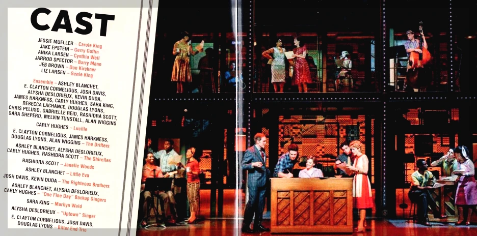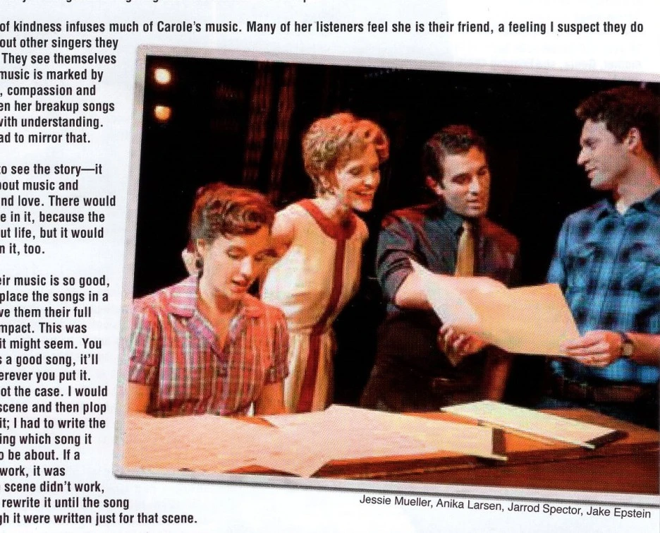 뮤지컬 뷰티플은 극작가이자 영화감독인 더글라스 맥그라스(주요 작품: 엠마, 브로드웨이를 쏴라, 퀴즈 쇼 등)가 대본을 썼습니다. 폴 블레이크(프로듀서), 마크 부르니(감독), 조쉬 프린스(안무) 등의 참여로 120분 뮤지컬이 초연됩니다. 캐롤 킹역은 시카고에 출연했던 제시 뮬러가 맡았고, 뮬러는 <뷰티플>로 2014년 토니 최우수 주연상을 받습니다.