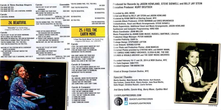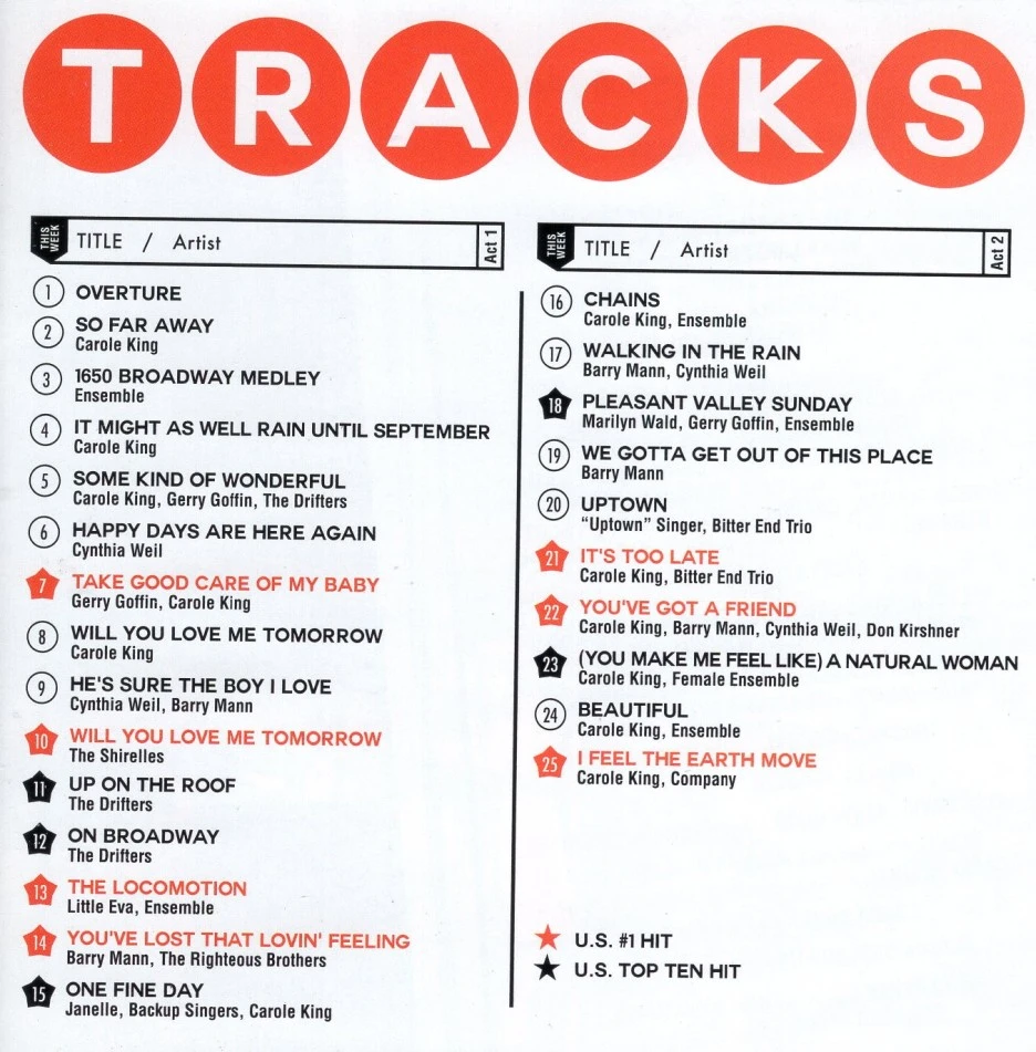 2014년 1월 브로드웨이에 입성한 뷰티플은 녹음 과정을 거쳐 5월 음반으로 출시됩니다. 2막 구성에 총 24곡이 스토리에 맞춰 짜임새있게 전개됩니다. 빌보드 톱 10에 오른 곡이 절반, 정상에 오른 곡은 7곡입니다. 여기서 킹이 작곡한 곡은 절반입니다.