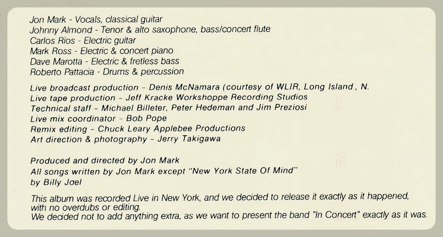 빌리 조엘의 "New York State of Mind"를 제외한 전곡이 존 마크의 오리지널입니다.