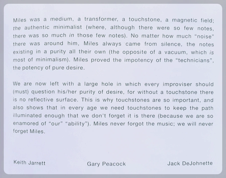 어쨌든 이 세 거장은 그들이 시금석이라 부르는 마일즈 데이비스의 영향을 받을 수 밖에 없었겠지요.