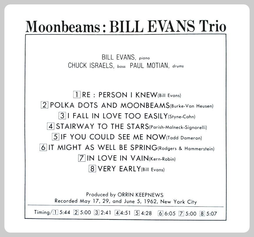에반스의 곡으로 시작하여 여섯 곡의 스탠더드 곡들이 이어지고 에반스의 곡으로 끝납니다.