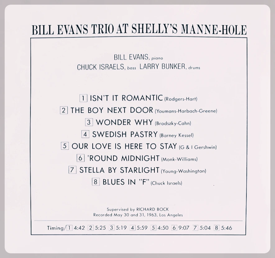 셸리(Shelly)는 웨스트 코스트에서 활약한 쿨 재즈 드러머 셸리 맨(Shelly Manne, 1920~1984)을 말합니다. 셸리가 운영한 재즈 클럽 이름이 맨홀(Manne-Hole)입니다.
