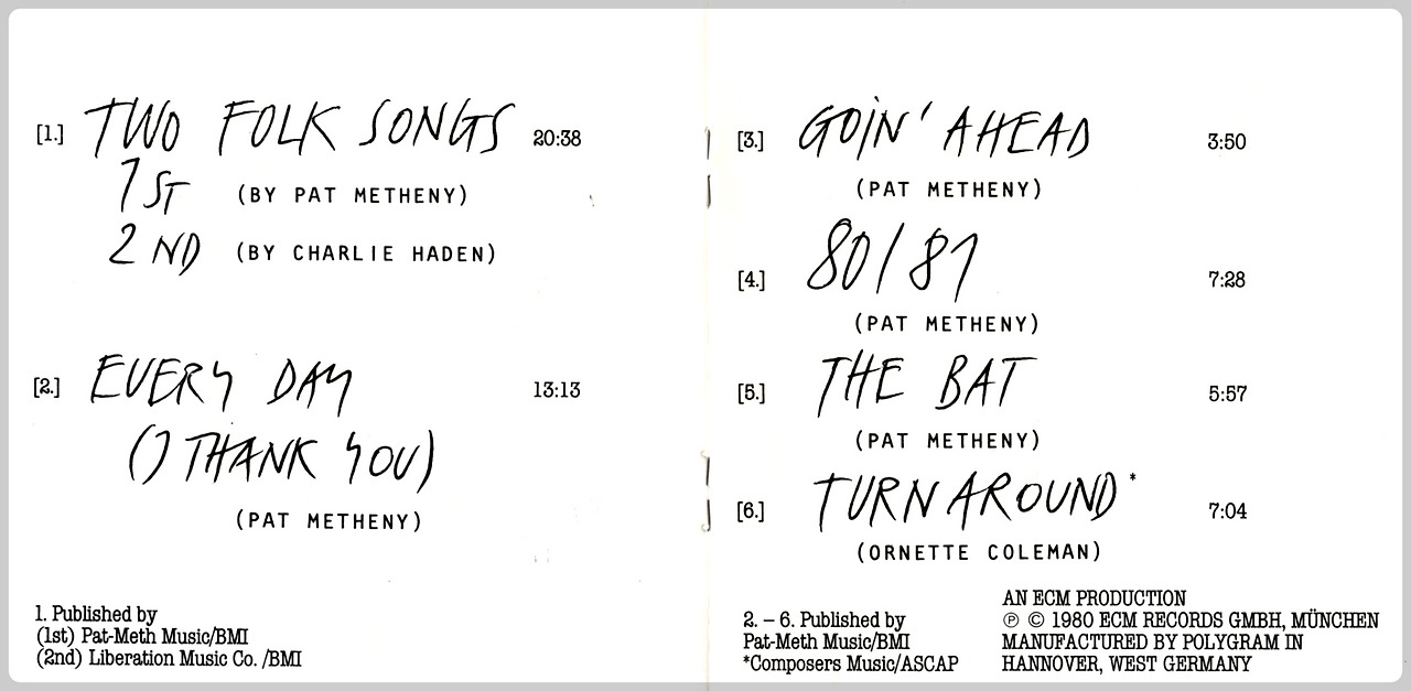 이 앨범을 대표하는 첫 곡 "Two Folk Songs"는 메스니와 헤이든의 포크 송을 묶었습니다. 박진감 넘치는 기타 인트로에 브렉커의 유려한 색소폰, 이 둘의 연주를 받쳐주는 헤이든의 베이스 워킹과 디조넷의 강력한 드러밍. 리듬 섹션은 티를 내는 듯 안 내는 듯 색소폰과 기타의 인터플레이를 지지하고 있습니다. 이 곡은 멜로디 라인도 귀에 쏙 들어옵니다.