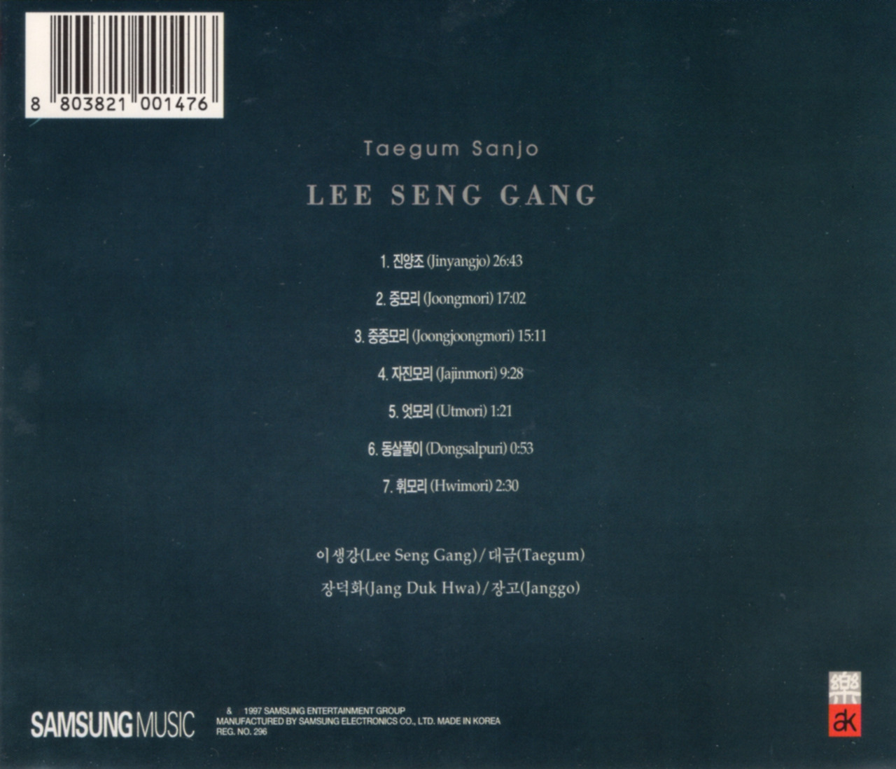 총 5곡입니다. 첫 곡은 스승 한주환을 기리며 스승의 연주풍을 따름니다. 나머지 네 곡은 진양, 중모리, 중중모리, 자진모리 순으로 리듬이 빨라지는 산조의 전형을 제시하고 있습니다. 이 작품을 들으면 양동마을, 마을의 학들, 그 옆의 연꽃이 떠오릅니다. 청아하고 옥구슬 같은 대금 소리가 학을 뛰놀게 합니다. 만개한 연꽃은 대금 소리에 살랑거립니다. 이 앨범은 삼성뮤직을 통해 발표되었습니다. 예전에 삼성이 나이스라는 브랜드로 음반사업을 했던 적이 있었습니다.