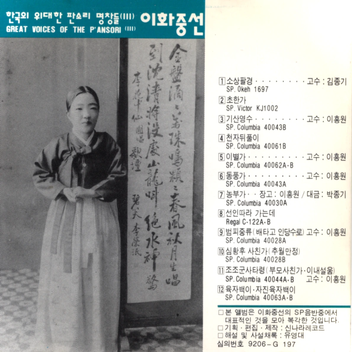 신나라 레코드가 기획하여 발매한 판소리 명창 시리즈 중 이화중선 편입니다. 그의 SP 음반들 중 대표적인 곡을 복각한 컴필레이션 CD입니다.