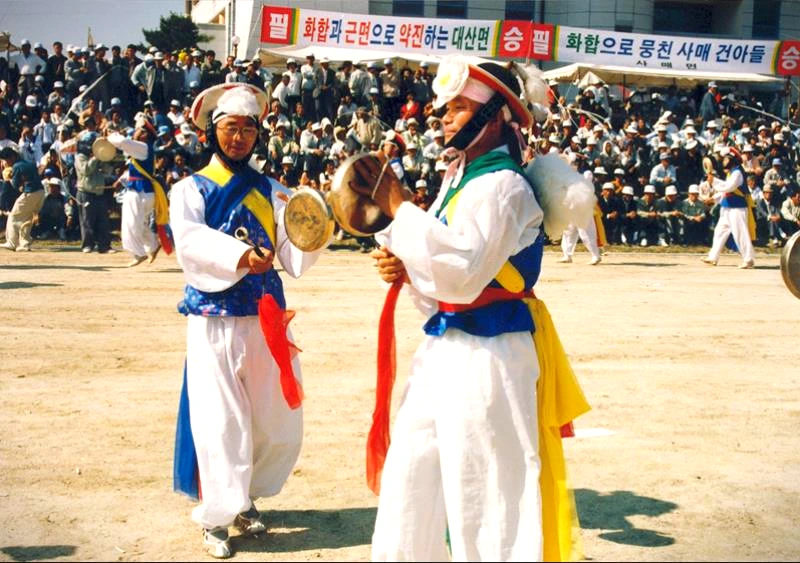 농부들이 사시사철 농경 활동을 하며 짬짬이 모여 행사를 합니다. 북, 장고(장구), 꽹과리, 징 등 타악기에 태평소, 나발 등의 관악기가 편성되고 연주자들은 농악에 걸맞은 모자, 의상, 띠, 신발 등을 착용합니다. 여기에 여러 형태의 농기(깃발)들이 분위기를 고양시킵니다.