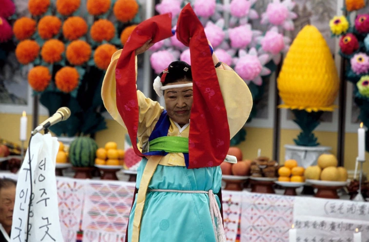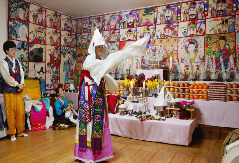진도씻김굿에 무녀가 지전을 들고 춤을 추며 망자의 넋을 위로하고 극락왕생을 기원합니다.